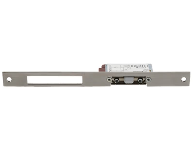 This fully reversible, highly resistant electronic door strike for installation into door frames is one of the smallest strikes on the market with a width of just 16 mm, the perfect choice for narrow profiles, such as aluminum, wood or PVC. This strike is blocked when under power. When the power is disconnected, the strike is unblocked, and the door can be opened. It also has a microswitch that monitors door status (open or closed). Door status can be sent to the monitoring system via output terminals. This version is supplied with a long sheet metal cover plate (250 mm).